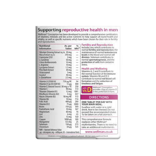 Wellman Conception is formulated with specific nutrients, including zinc, which contributes to normal fertility and reproduction. Zinc and vitamin C also contribute to the protection of cells from oxidative stress, which is important for healthy sperm production.