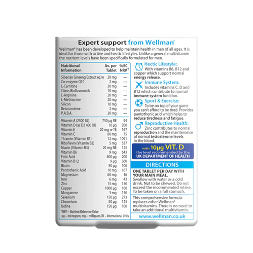 B vitamins, zinc, and iron in Wellman Max help contribute to normal energy release and cognitive function.In summary, Wellman Max is designed to provide comprehensive nutritional support for men’s overall health, energy, immunity, and bone strength through its advanced micronutrient, omega fatty acid, and calcium/vitamin D formulations.